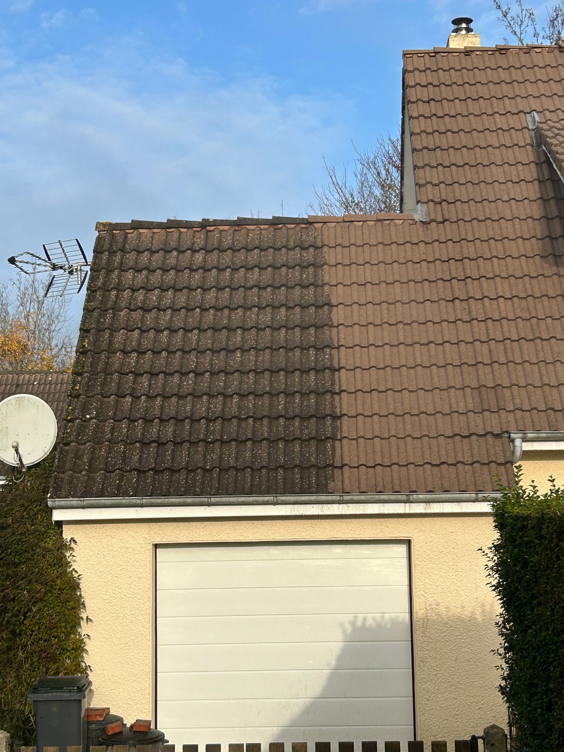 Notre travail commence toujours par le démoussage. Le toit retrouve une surface uniforme sur laquelle nous appliquons le traitement hydrofuge. Les végétaux qui favorisent les infiltrations d’eau sont supprimés. Ce produit hydrofuge renforce également les matériaux de la couverture.